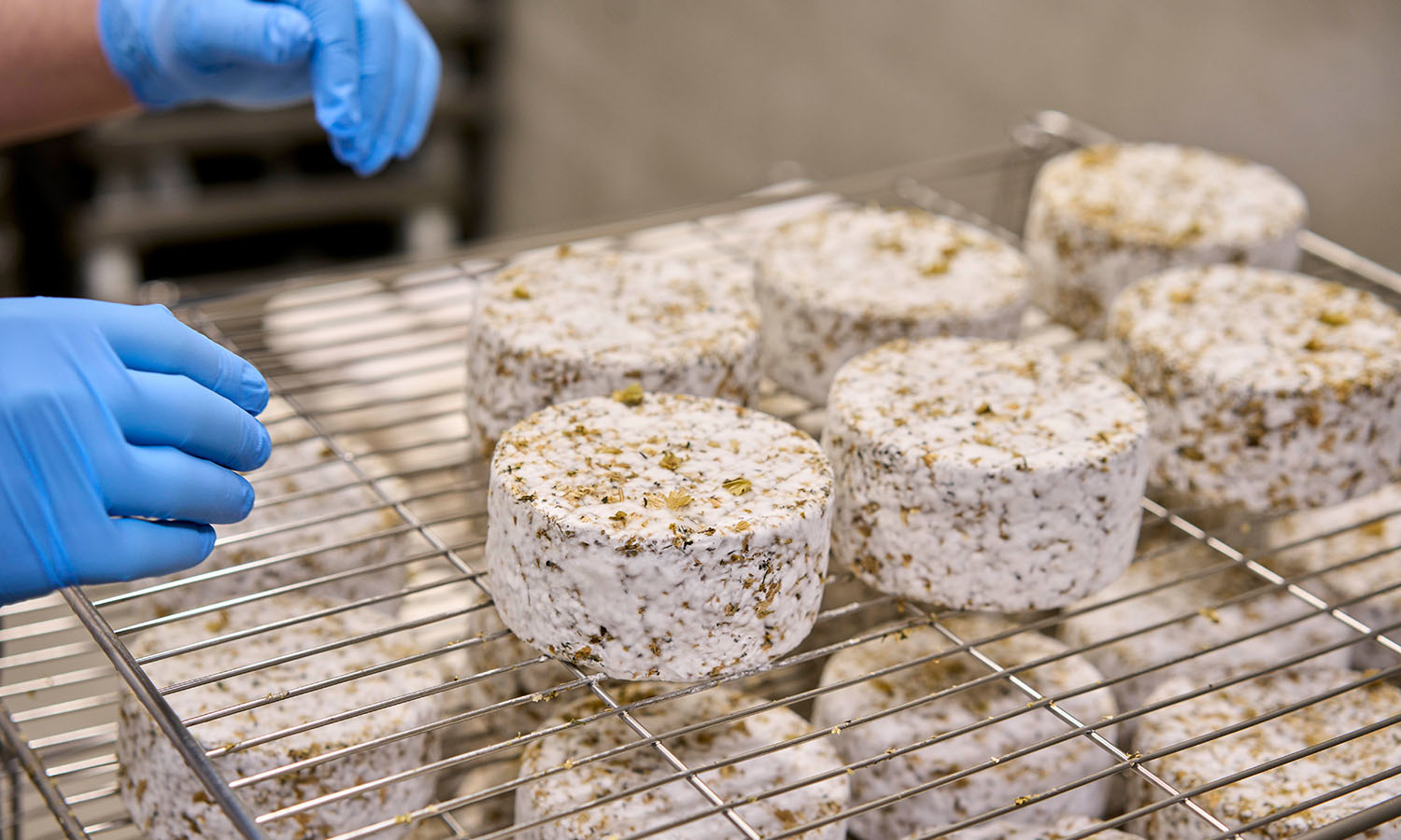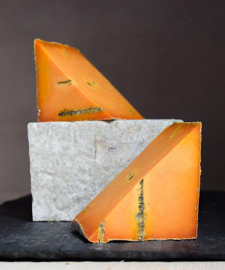 Among Murray’s latest experiments is Project X, a cow’s-milk tomme coated in a generous layer of fennel pollen before being bathed in Gewürztraminer – a cheese that has quickly become a customer favourite. Another bold creation is its Barnstorm Blue, which is moulded into a cube and washed with a rotating local malty ale to create a sticky coral-hued rind.