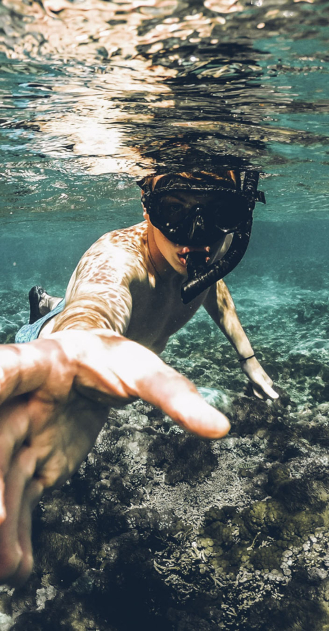 And don’t forget your fins: awkward as they may feel at first, fins are indispensable for helping you conserve energy as you swim along, and thus extending your snorkelling pleasure. Beginners should go for full-foot fins rather than adjustable ones, and again, ensuring a good fit is key.
