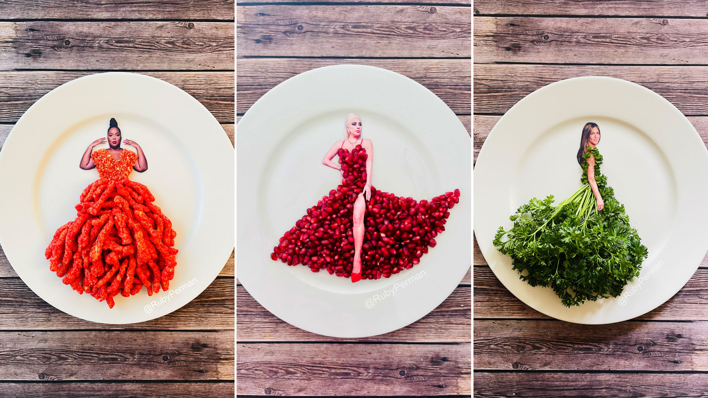 The combination of my love for fashion and food design merged during the very beginning of the pandemic, when all the award shows were cancelled due to Covid. My idea was to create a miniature red carpet fashion show in my kitchen with celebrities dressed in food fashion. TikTok was beginning to explode, and my post on TikTok – Jennifer Lawrence dressed in a pomegranate – went viral, and it blew up from there!