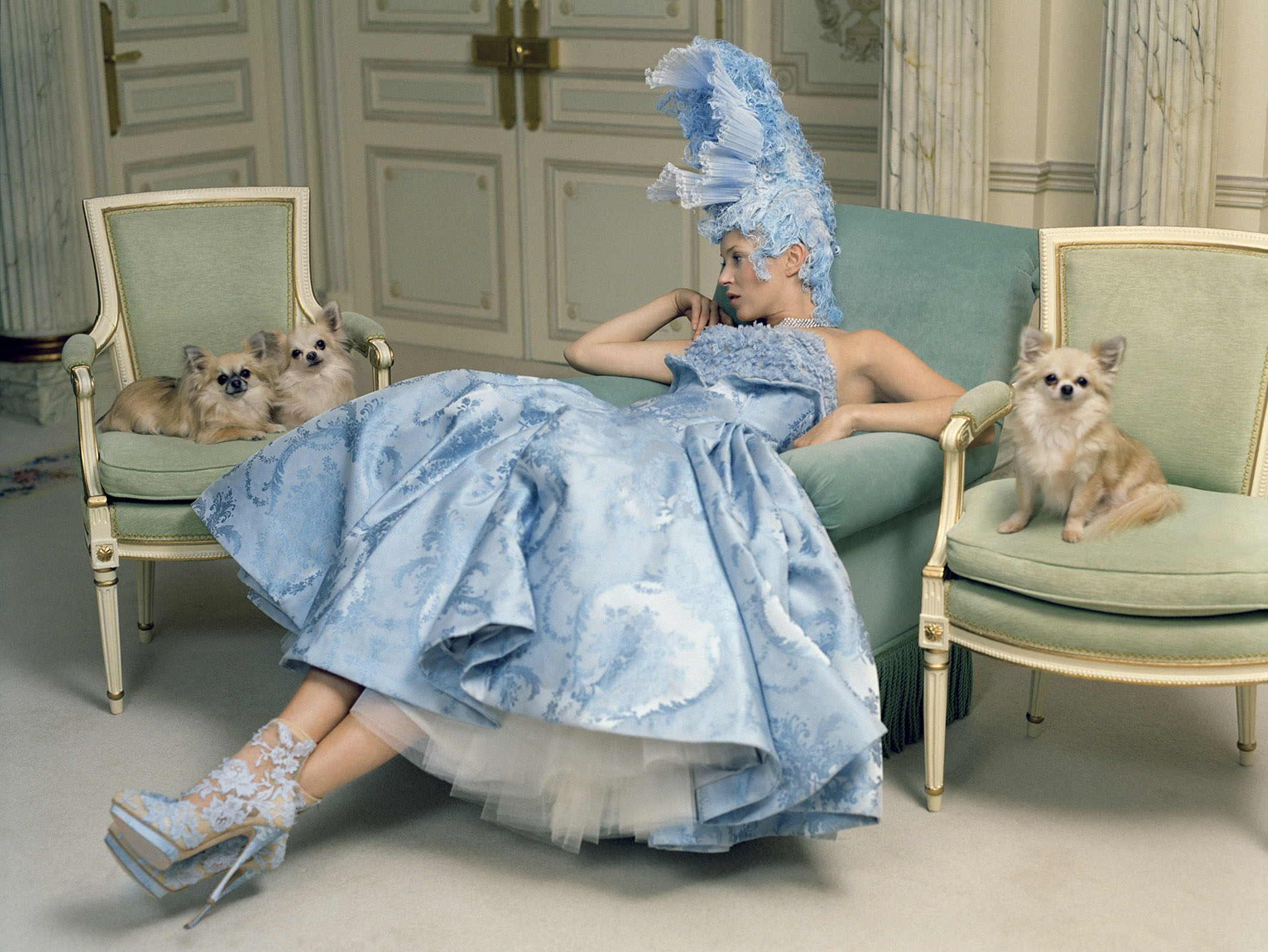 [Images, Left: Kate Moss, Fashion: Sarah Burton for Alexander McQueen, Van Cleef & Arpels, and Julian d’Ys, The Ritz, Paris 2012. (Photographs of Kate Moss at the Paris Ritz for Vogue US April 2012 issue) © Tim Walker. Right: One slipper belonging to Marie Antoinette beaded pink silk. Photo: CC0 Paris Musées / Musée Carnavalet – Histoire de Paris]