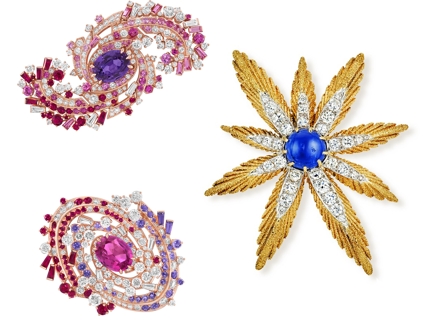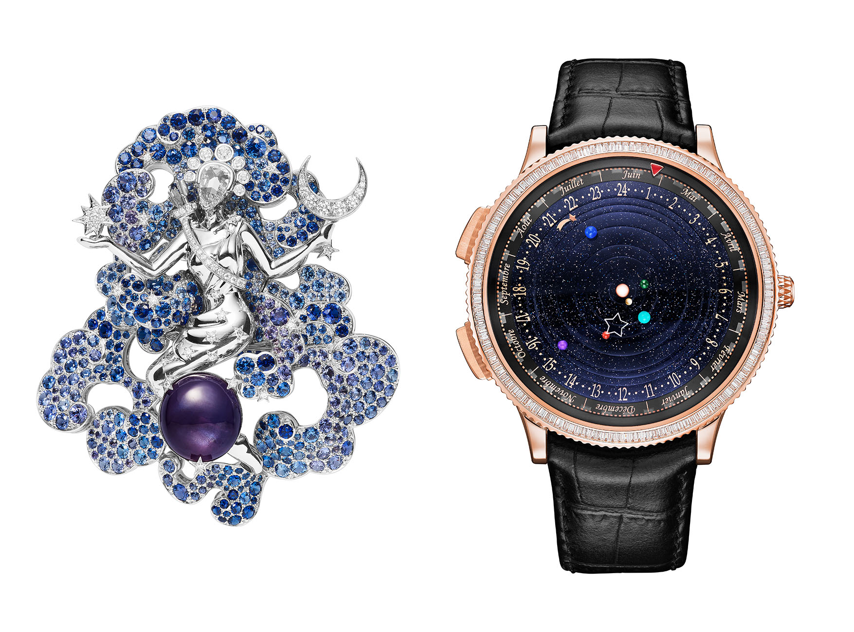 [Images, left to right: 1. Doubles galaxies (Double galaxy) clips, 2021. Sous les étoiles High Jewelry collection. 2. Asterisk clip, 1966. Van Cleef & Arpels Collection. 3. Diane (Diana) clip, 2011. Bal du Siècle, Bals de Légende High Jewelry collection 4. Midnight Planétarium watch, 1951. Van Cleef & Arpels Collection. Images courtesy of Van Cleef & Arpels]