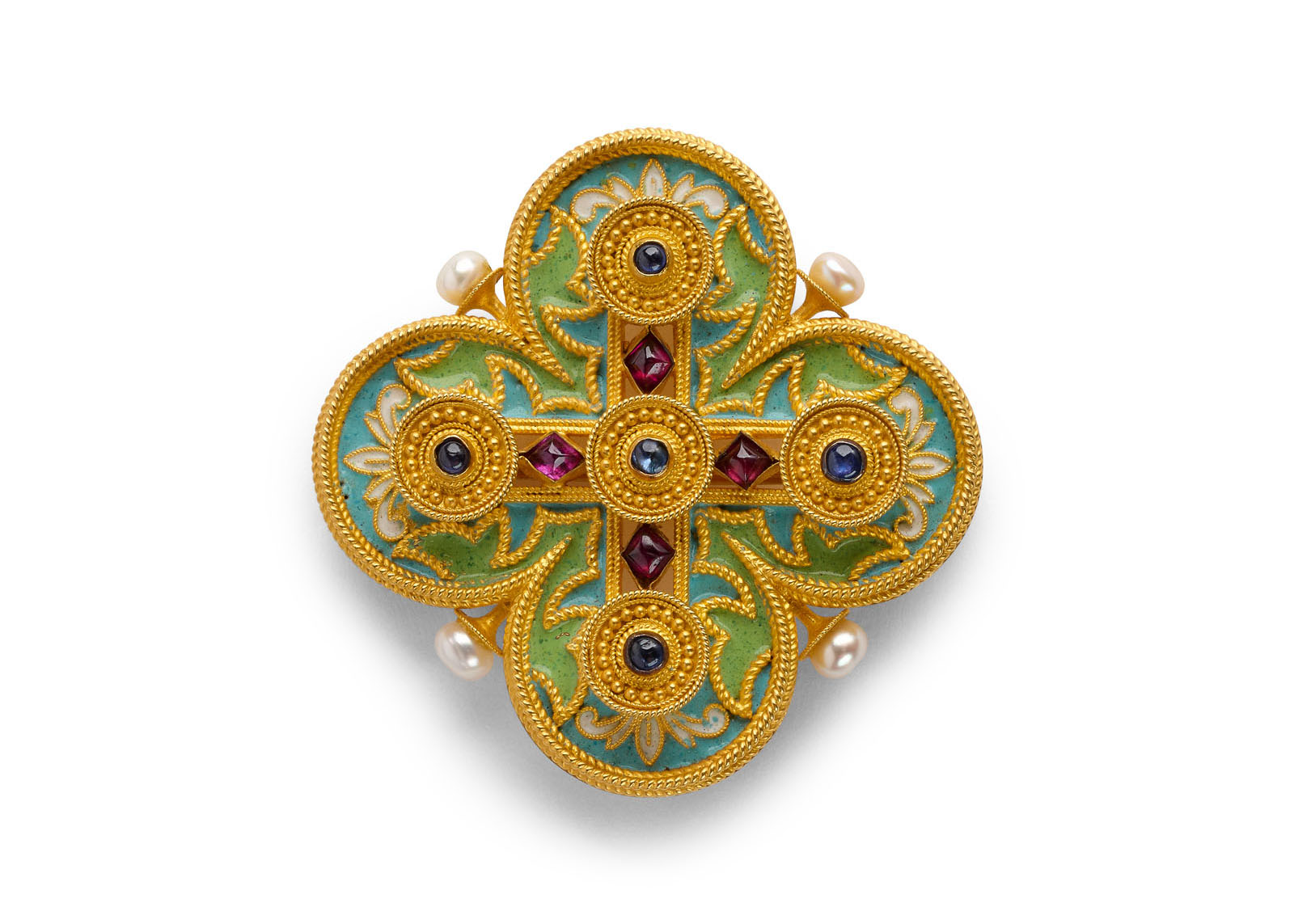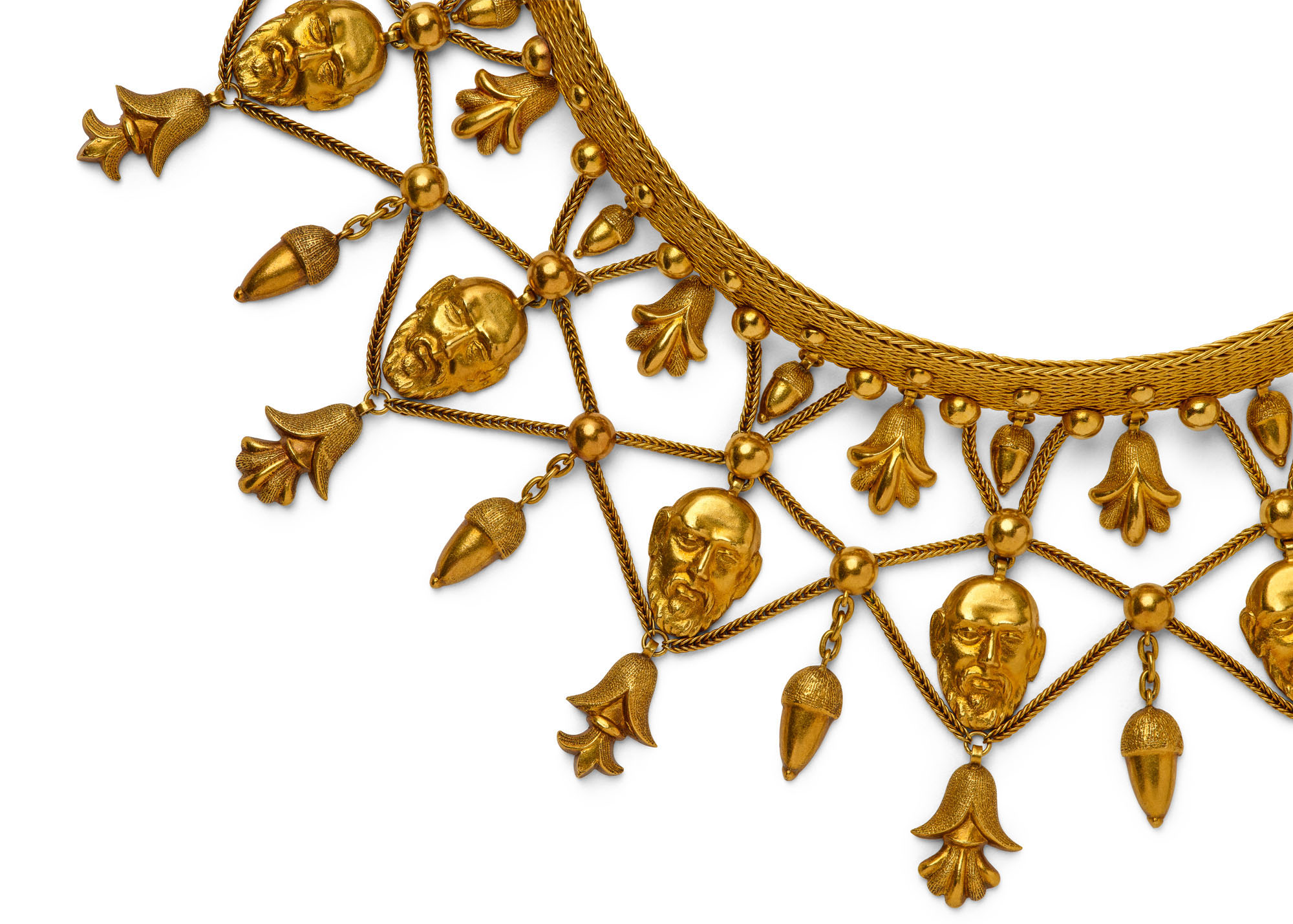 [Images, Left: Castellani (Italian, 1814–1930). Quatrefoil brooch, mid- to late19th century. Right: Giacinto Melillo (Italian, 1846–1915). Ruvo necklace, about 1870–80. Collection of Neil Lane. Photographs © Lendon Flanagan]